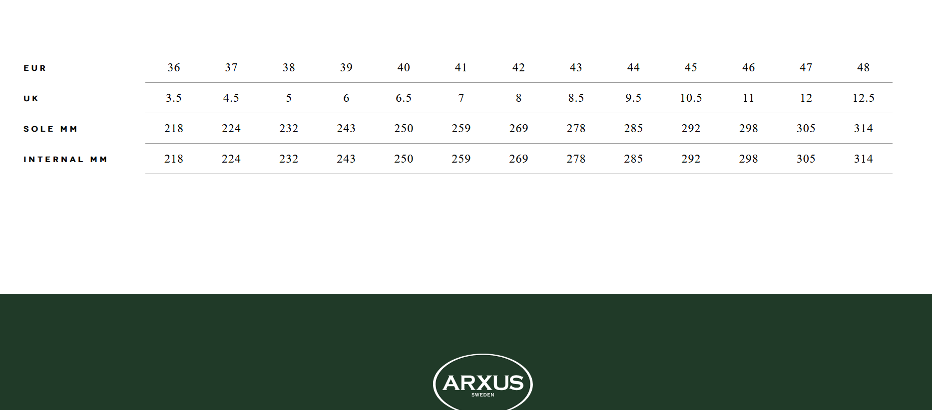 Die Arxus Größen-Tabelle bietet Ihnen eine einfache Möglichkeit, Ihre richtige Stiefel-Größe zu finden.
