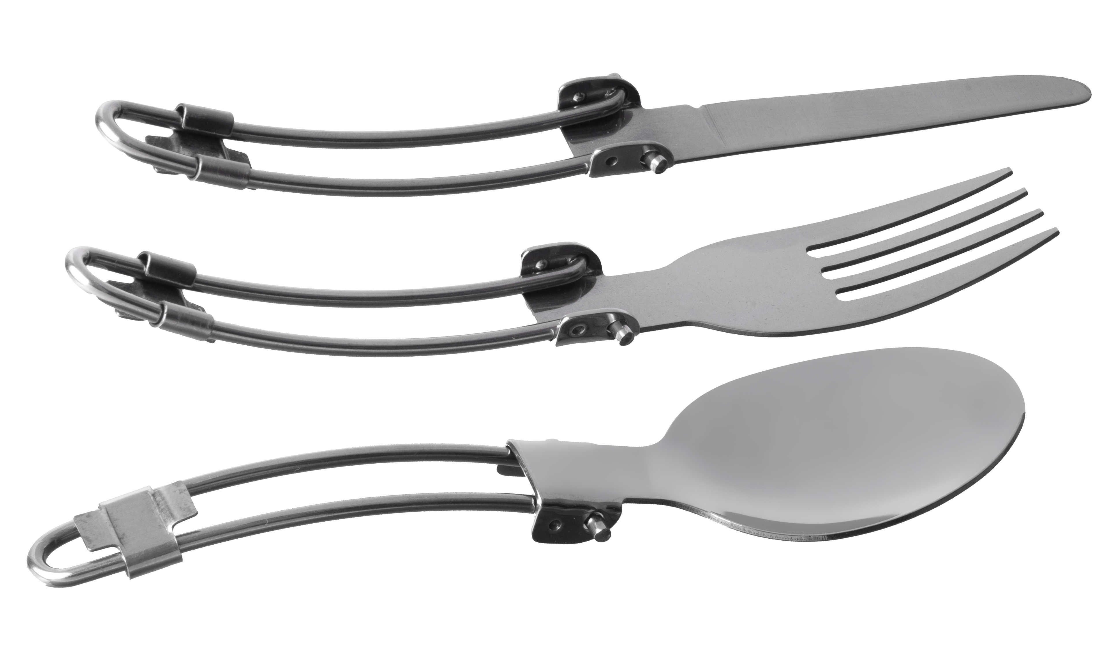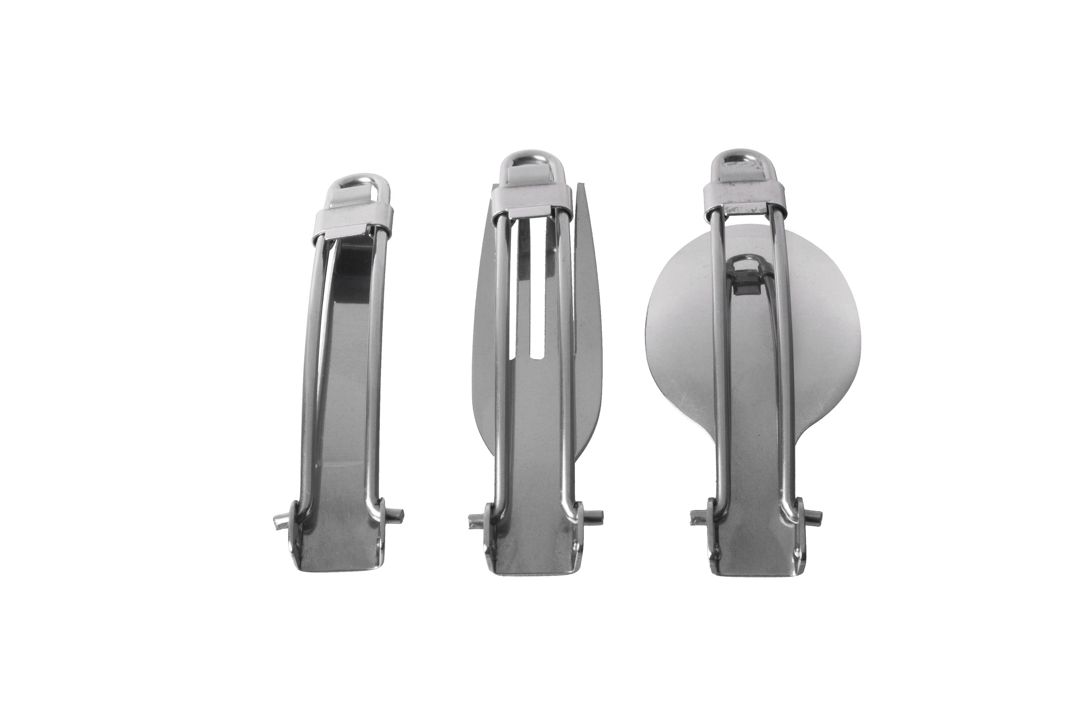 Es ist aus hochwertigem Edelstahl gefertigt und wird in einem praktischen Nylontäschchen geliefert. Die einzelnen Besteckteile sind zusammenklappbar und werden während der Benutzung arretiert.