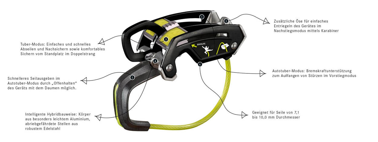 Einfaches und schnelles Abseilen und Nachsichern sowie komfortables Sichern vom Standplatz im Doppelstrang