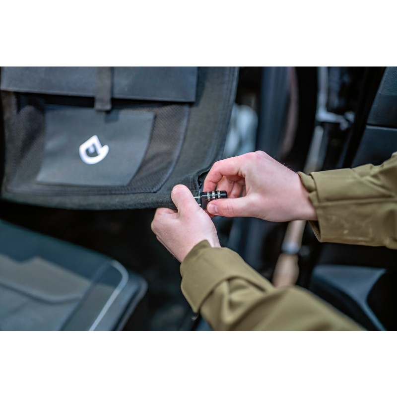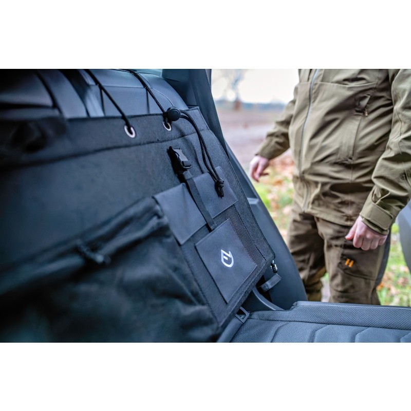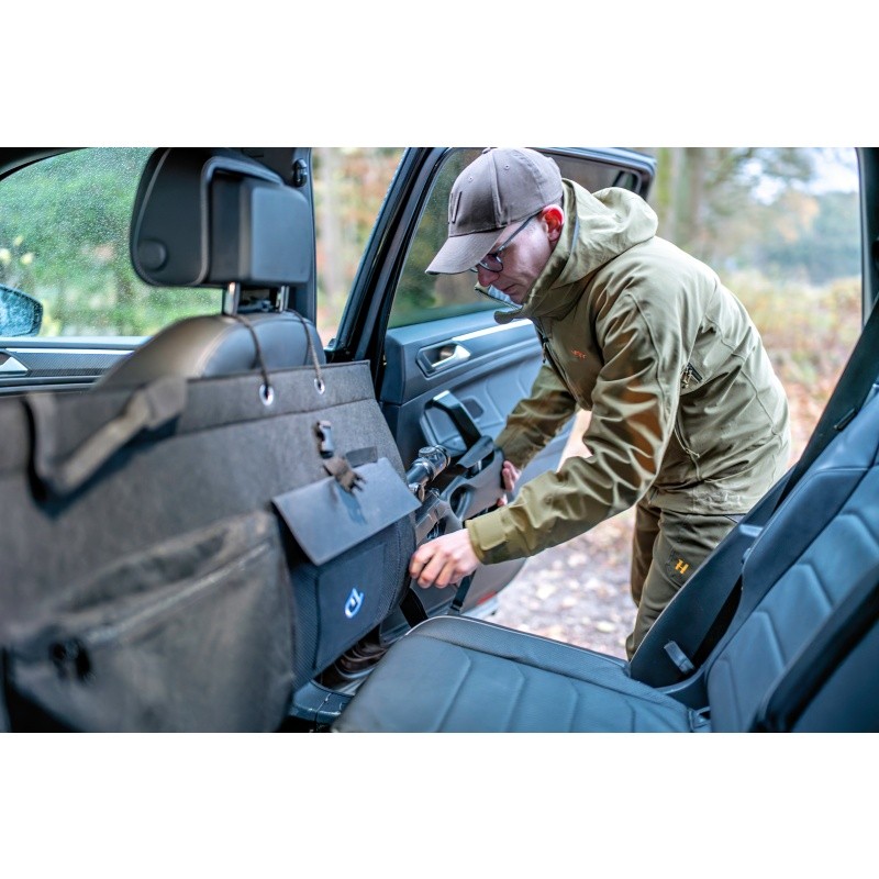 Hier finden Jagdschein, Munition oder Reinigungszubehör ihren festen Platz. Die Steckverschlüsse und robusten Riemen garantieren eine sichere Fixierung, während die seitlichen Zugkordeln für optimalen Halt im Fahrzeug sorgen – ob auf der Rückbank oder im Kofferraum.