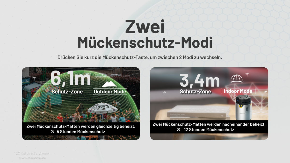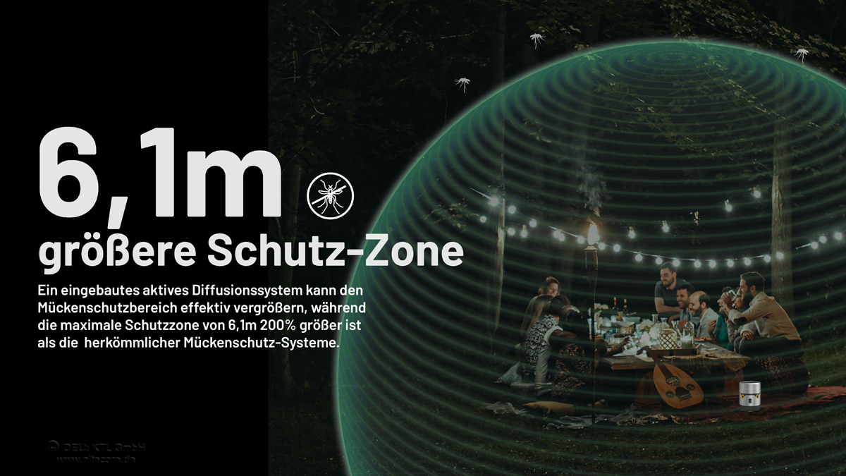 ✓ Es entsteht eine Wirkbereich mit ca. 6 Meter Durchmesser im High-Mode. Im Low-Mode beträgt der Durchmesser der Schutzzone ca. 3,5 Meter