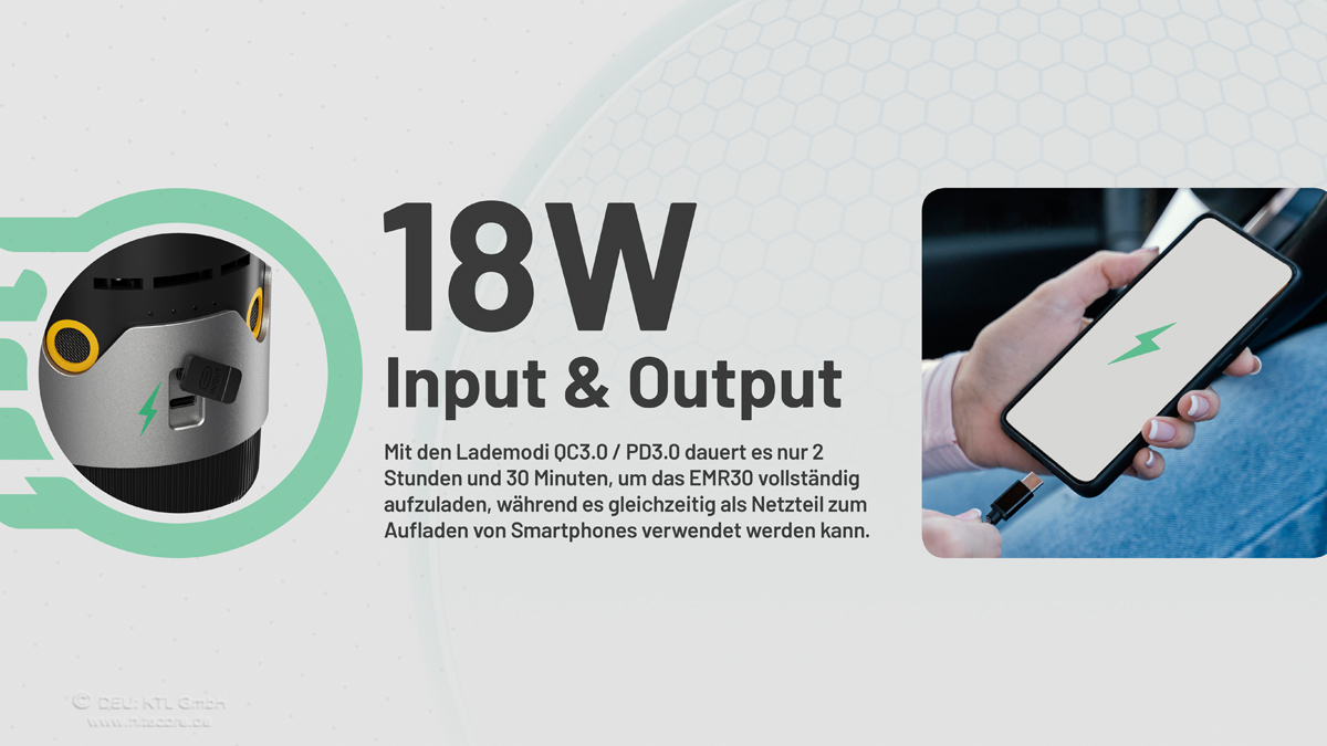 ✓ Der fest verbaute Li-Ion Akku hat eine Kapazität von 10400mAh und kann als Powerbank (max. 18W Output) genutzt werden.