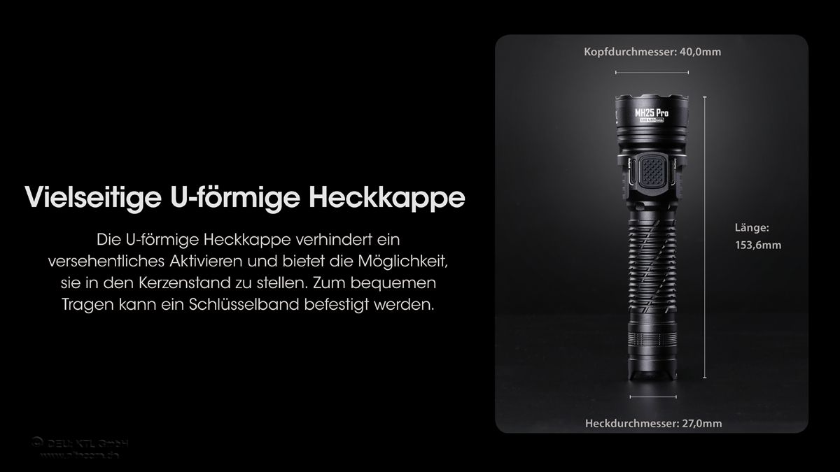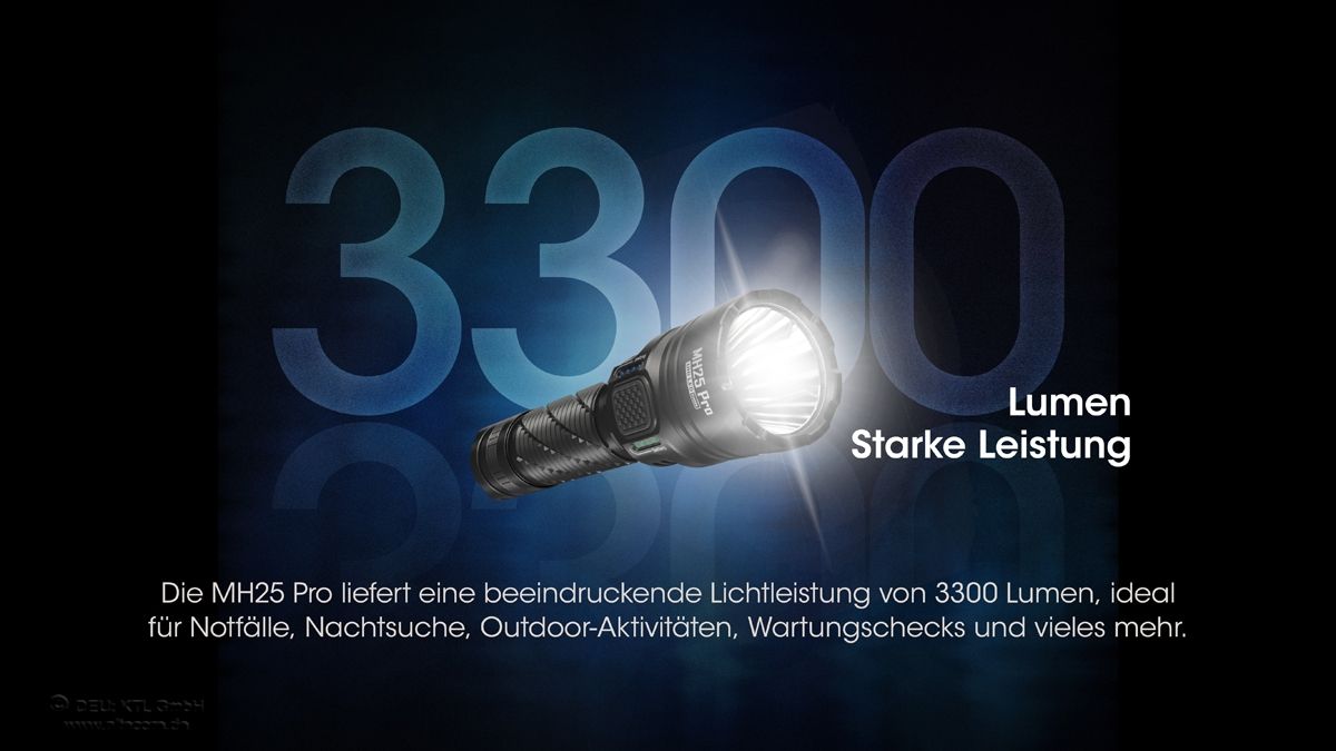 Die Leistungsdaten der MH25 Pro sind beeindruckend und konkurrenzlos bezogen auf die Baugröße der Lampe: 3300 Lumen Leuchtstärke, 705 Meter Leuchtweite, USB-C-Aufladung, 5300mAh Akku.