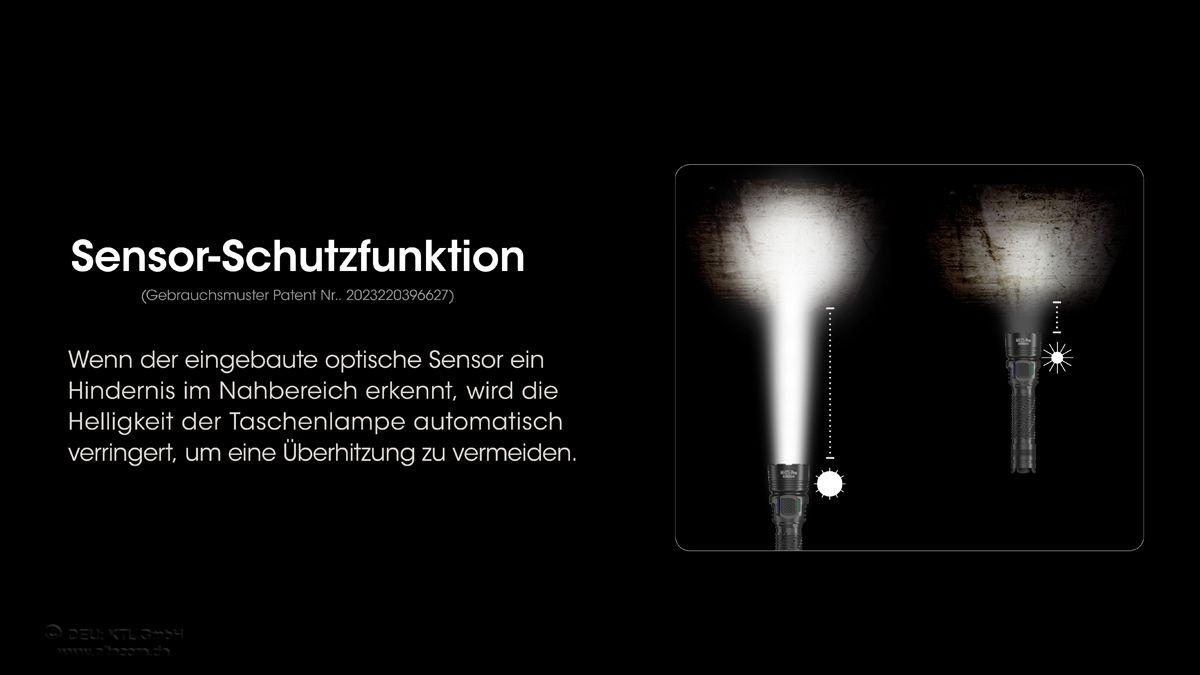Ein eingebauter optischer Sensor reduziert im Falle eines Hitzestaus die Leuchstärke der MH25 Pro sofort, um eine Beschädigung der Lampe oder eines Gegenstandes (z.B. Rucksack) zu verhindern.
