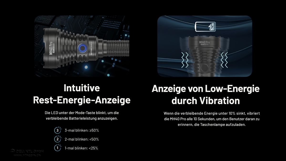 Ferner vibriert die MH40 PRO leicht sobald der Ladezustand unter 10 % absinkt.