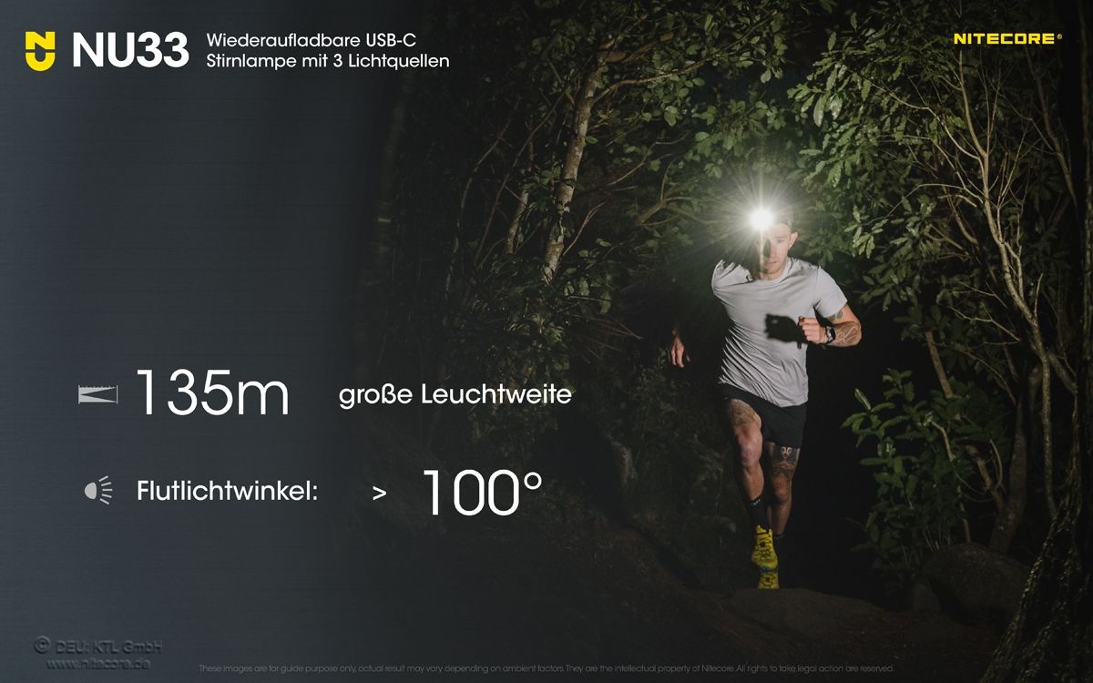 Die weiße Haupt-LED leistet maximal 700 Lumen. Für die Ausleuchtung im Nahbereich verfügt die NU33 über eine CRI-LED mit zwei Leuchtstufen.