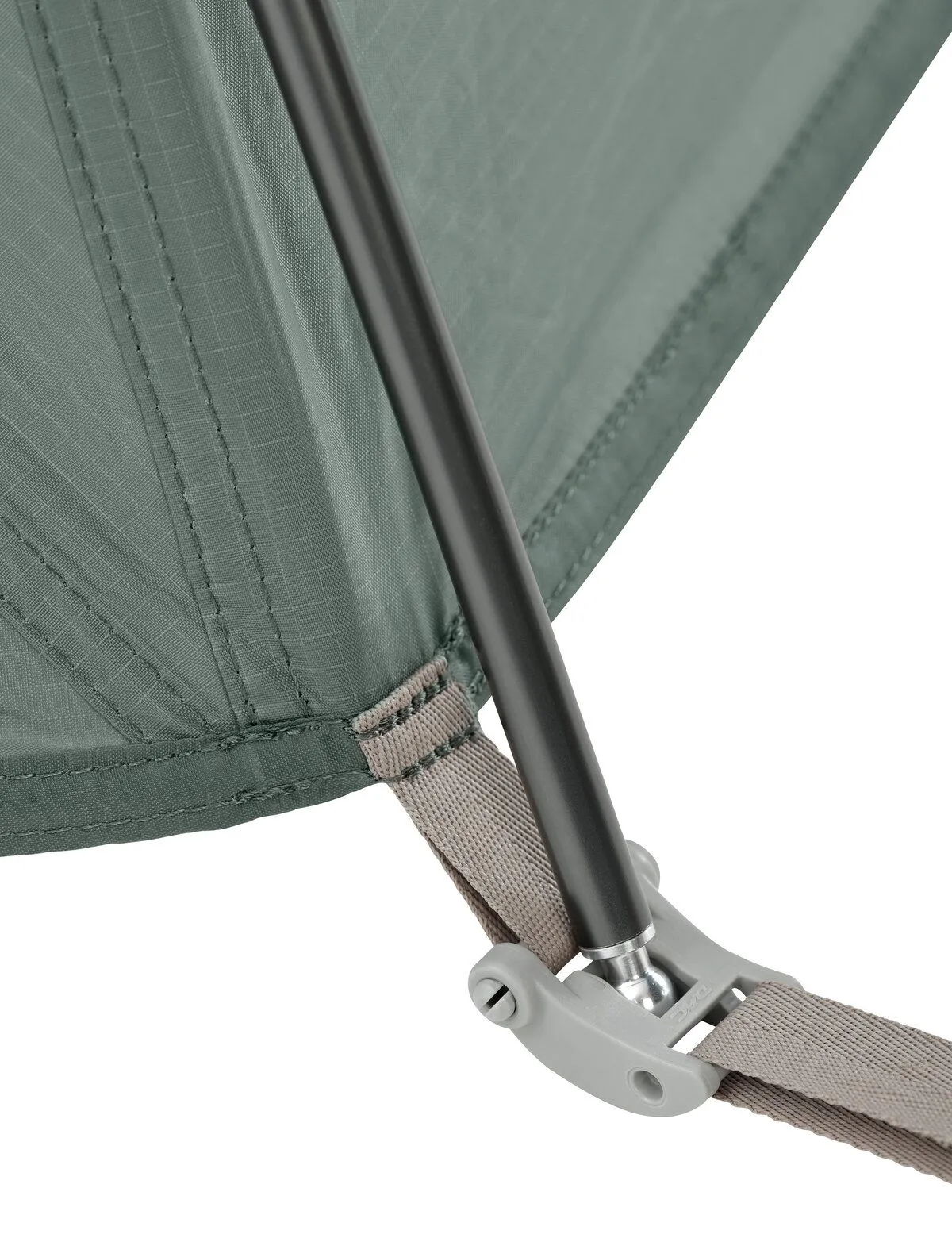 Darüber hinaus ist das Zelt mit zwei regengeschützten Lüftungsöffnungen über den Ein- und Ausgängen ausgestattet, die sich stufenlos regulieren lassen. Die Apsiden kann man vollständig aufwickeln, um den Blick aus dem Innenzelt heraus zu genießen.