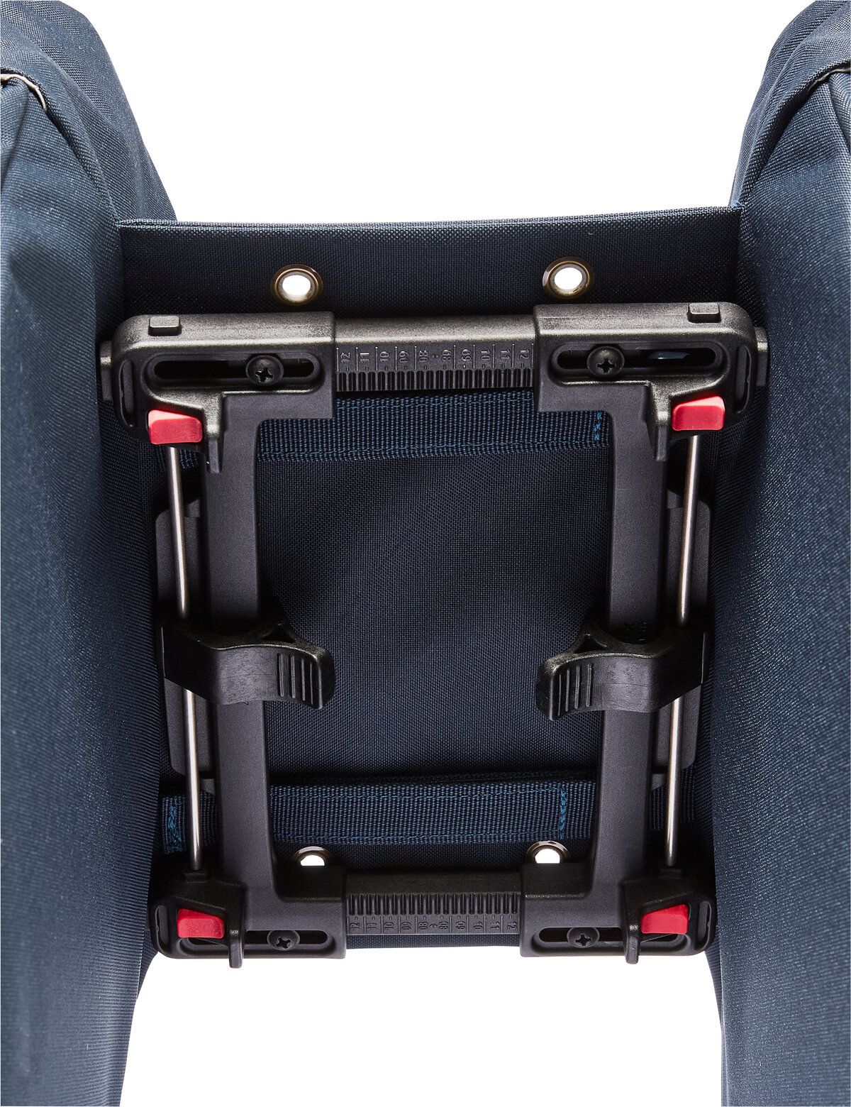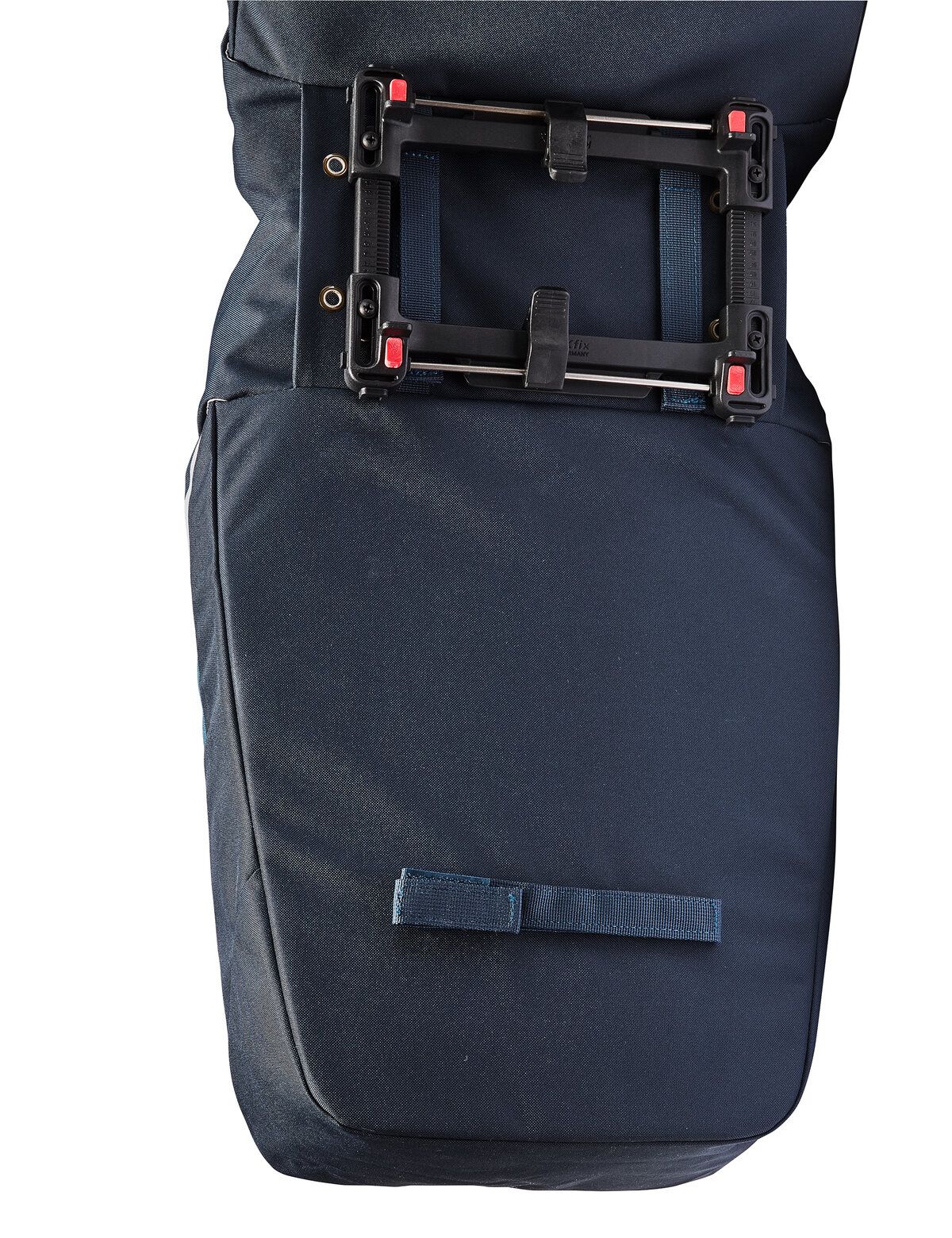 Der Steg, der die beiden Taschen verbindet, kann einfach aufgelegt werden. Zur einfachen Befestigung auf dem Gepäckträger ist die Doppel-Fahrradtasche mit einer vormontierten UniKlip 2 Adapterplatte ausgestattet. Ein Haubendeckel verschließt die Taschen; durch den darunterliegende Staubalg kann der Inhalt komprimiert werden.